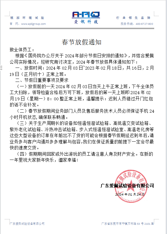 - 廣東愛佩試驗設備有限公司春節放假通知