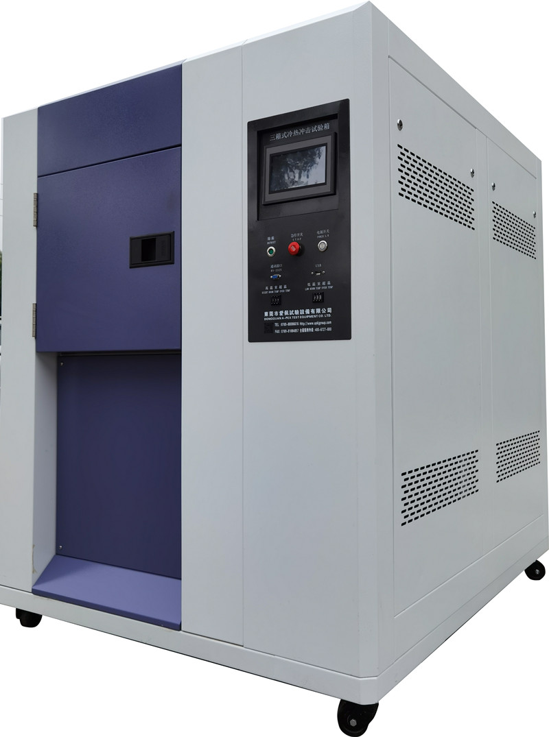 1、三箱設備區分為高溫區、低溫區、測試區三部分,測試樣品完全靜止于測試區。采用獨特之蓄熱、蓄冷結構,強制冷熱風路切換方式導入測試區,沖擊時高溫區或低溫區的溫度沖入測試區進行沖擊,完成冷熱溫度沖擊測試。